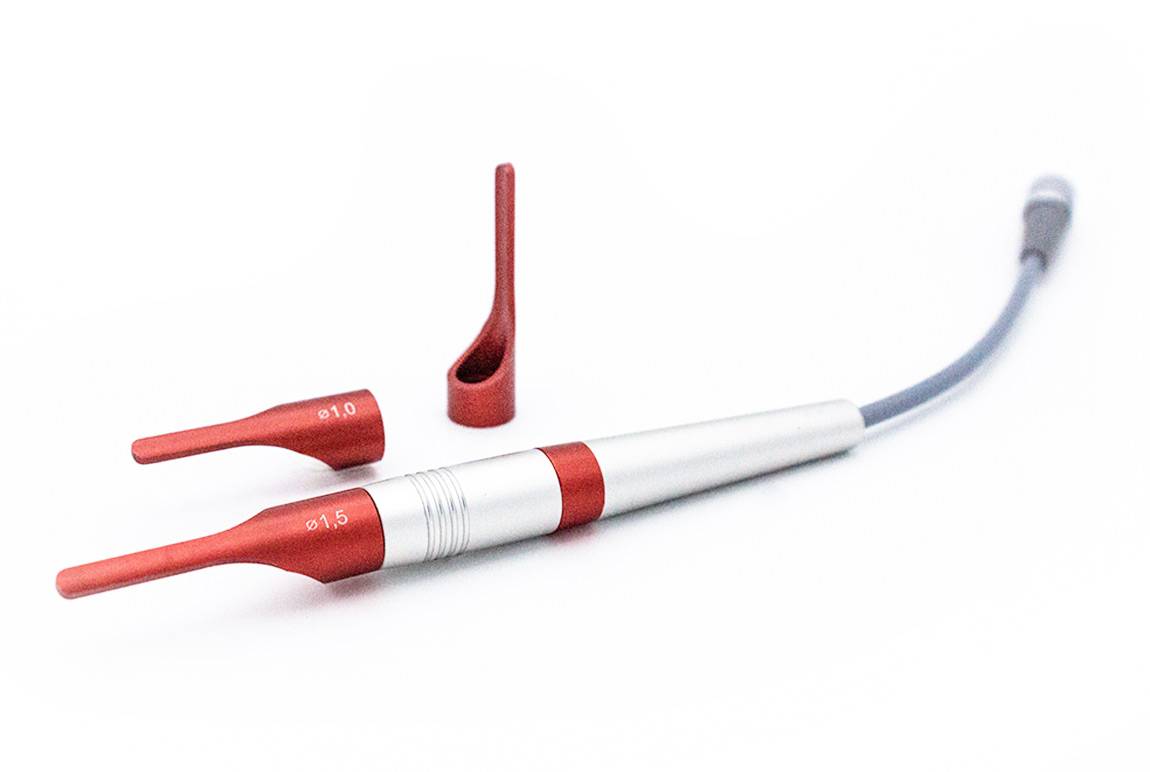 They consist of a handle for free-hand application, focusing beam guiding optics, spacers and a laser coupling system (plug).
